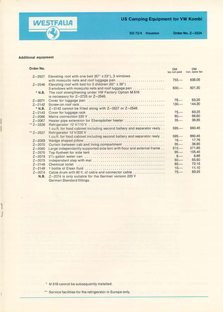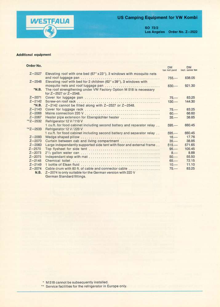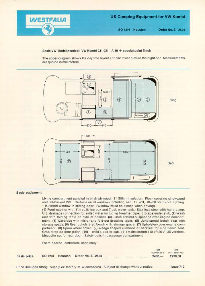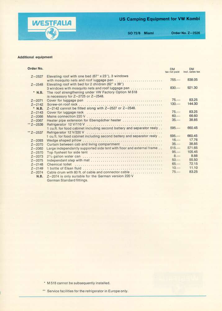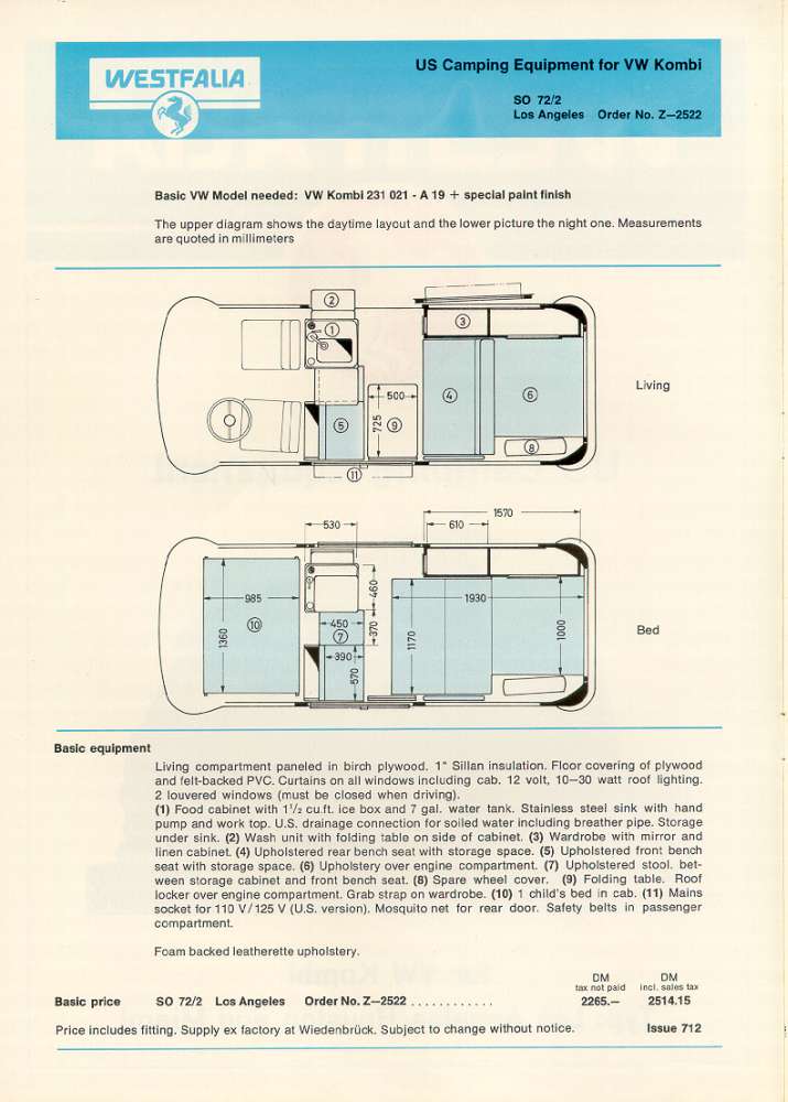 Westfalia US Camping Equipment for VW Kombi Typ: Los Angeles, Houston and Miami (1970)