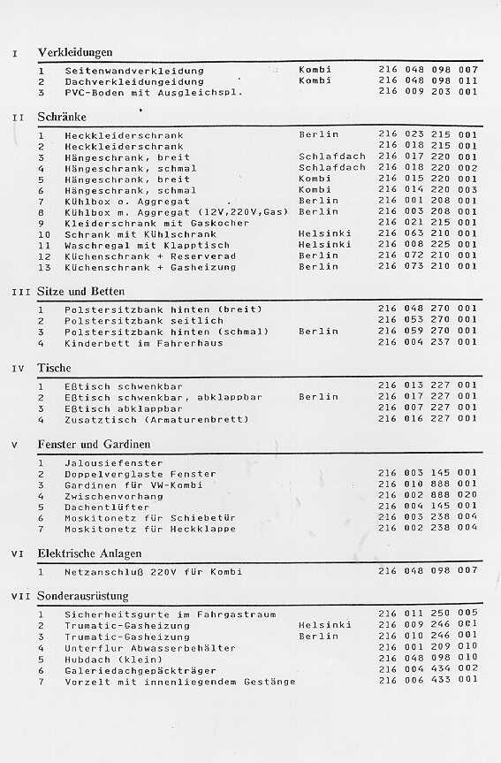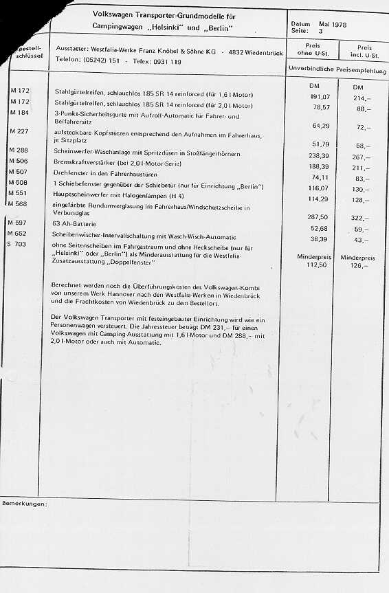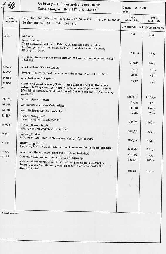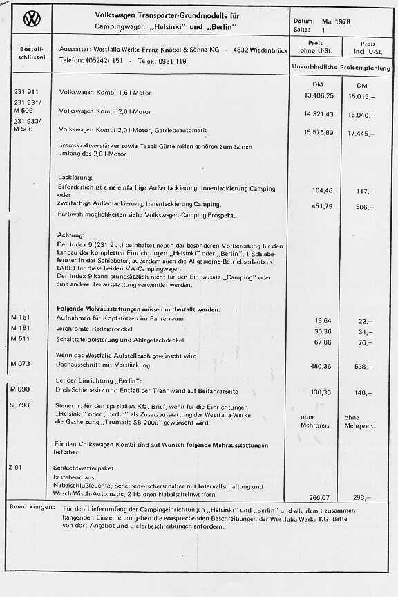- Preisliste für VW Grundfahrzeuge (Camping) 1978