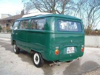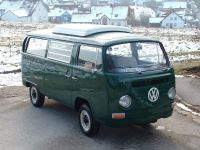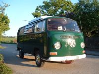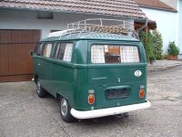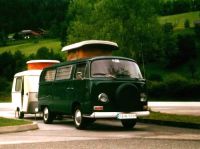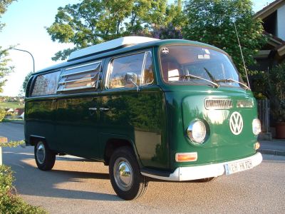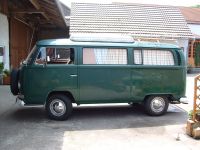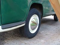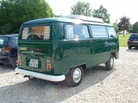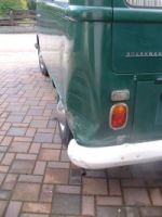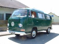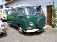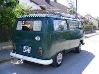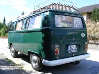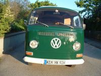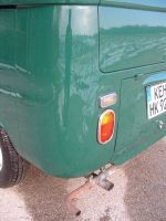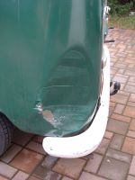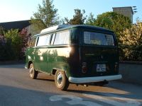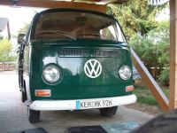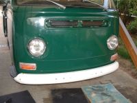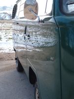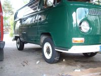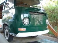 Natürlich wurde der Unfall fachmännisch instandgesetzt, außerdem noch kleine Roststellen am Scheibenrahmen und die durchs Reserverad entstandene Löcher in der Front geflickt. Dazu wurden noch ein paar kleine Rostellen im hinteren Bereich und den Kniestücken beseitigt und der Bulli dann komplett in Originalfarbe deltagrün lackiert. Stoßstangen, VW Zeichen und Hubdach in pastellweiß L90D. Des weiteren wurden noch fünf Felgen und die Anhängerkupplung sandgestrahlt und neu lackiert, und der gesamte T2a mit Wachs versiegelt. (Die Fotos täuschen: matte Stellen auf dem Lack und die braunen Stellen in den Radhäusern sind vom Wachs).