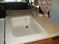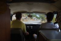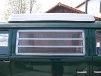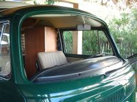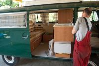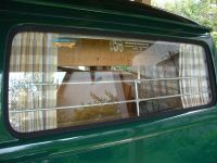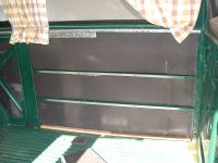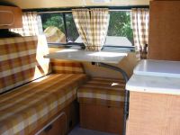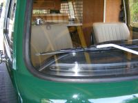 Klappsitzbank mit ca. 160cm Breite, einem Kleiderschrank hinter dem Fahrersitz mit dahinter anschließendem Seitensitz und daran angebrachten Tisch. Hinter dem Beifahrersitz befindet sich dann noch ein Küchenschrank mit Spüle, Wassertank und Handpumpe und einer Kühlbox, die aber nicht elektrisch, sondern nur mit Trockeneis oder Eisblöcken betrieben werden kann. Des weiteren enthält die Ausstattung ein sehr praktisches Lamellenfenster und das Westfalia Hubdach, das für Küchen- und Campingbetrieb ausreichende Stehhöhe gewährt und über drei aufzippbare Öffnungen verfügt. Um eine abendliche Privatsphäre zu gewährleisten stattet Westfalia alle Campingfahrzeuge mit einem Vorhangsatz aus, der vorne eingeknöpft wird, und sonst rundum nur zugezogen wird. Interessant bei "Hermann": der Vorhangsatz entspricht dem Karomuster der Sitze, was wohl eine Sonderbestellung zu sein scheint, denn normalerweise wurden zu kariersten Sitzen einfarbige Vorhänge und umgekehrt geliefert. Auch das Aufpreispflichtige Mückennetz für die Heckklappe befindet sich im Fahrzeug und leistet immer noch gute Dienste.