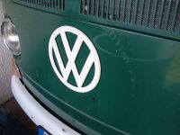 Am Vortag hab ich den Bulli abgeholt und ihm gleich das Reserverad vorne entfernt und durch das VW Zeichen ersetzt, so wie es ursprünglich vorgesehen war. Die Reserveradhalterung vorne wurde vom Erstbesitzer verbaut und vom TÜV 1981 eingetragen. Deutlich sichtbar an der Frontmaske bleiben die Spuren des Reserverads.