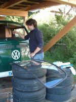 Als nächstes wurden am 15. Mai neue Semperit in 185 R14C montiert. Ein Satz Felgen, frisch sandgestrahlt und lackiert lagen sie ja seit längerem bereit, wurden noch mit frischen Schläuchen und dann mit den neuen Reifen bestückt. Nicht schlecht oder?