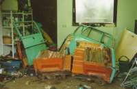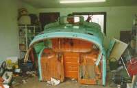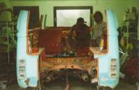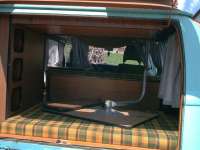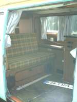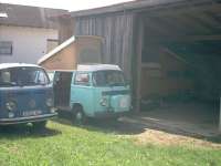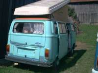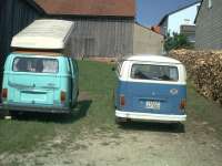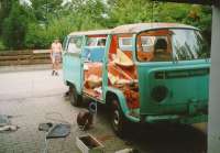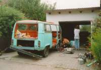 2001: Wurde von mir im Juni 2001 gekauft, für nur 200DM. Ist halt was zum schlachten. Es ist ein original Westfalia Camper mit der Berlinausstattung. Er hat die 50PS 1,6l Maschine mit 4 Gang-Schaltung. Außen ziemlich verkommen, wurde grün lackiert, war original orange, ist er innen sehr gut erhalten und voll ausgestattet. Motor und Getriebe waren gut und er war voll fahrbereit. Der Berlin ist inzwischen unters Messer gekommen, der war auch wirklich ein ziemliches Wrack, die Stoßstange z.B. war mit einem kräftigen Fußtritt "abmontiert", es waren alle Bullitypischen Roststellen vorhanden, aber Motor & Getriebe werden weiter ihren Dienst tun im Bulli von Christof. |